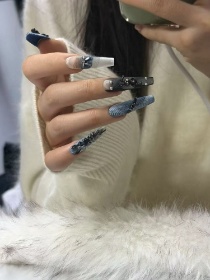 2. Multi-texture surface treatment: The blue sections of the nails use a textured embossing technique to create a woven fabric finish, while the fish-scale areas adopt a heat-transfer film application process for a seamless, glossy scale effect. The matte black and frosted white bases are treated with a matte coating process to deliver a smooth, non-reflective finish that contrasts with the shiny rhinestones and metal accents.