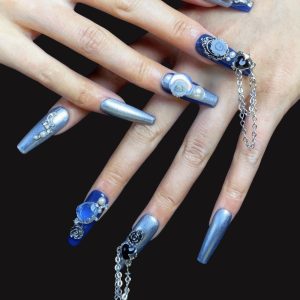 These avant-garde press-on nails fuse vintage denim texture with opulent gilded metal and dark crystal accents, featuring a bold indigo-blue base and a chunky square shape. Crafted with premium gel acrylic and fabric overlays, they deliver a striking mix of streetwear edge and luxury detailing with a durable, multi-textured finish.