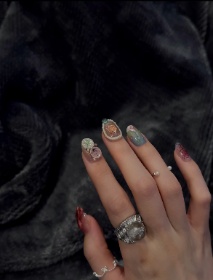 5. Glitter & Foil Embedding: Gold foil, iridescent glitter, and colorful flakes are embedded into the nail gel, adding a sparkling and shimmery effect under light.